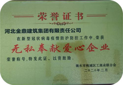 衡水市桃城區工商業聯合會為集團發放在新型冠狀病毒疫情防護防控工作中,無私奉獻愛心企業榮譽證書;